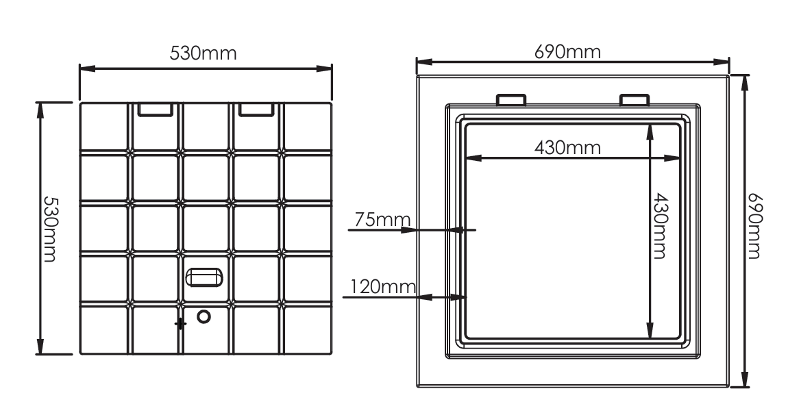- **Kapak Açıldığında Görünen Boşluk:** 430 x 430 mm